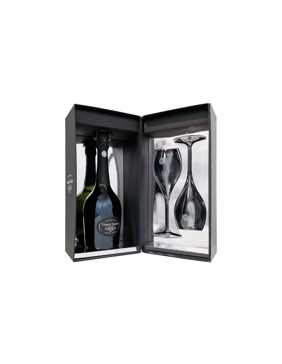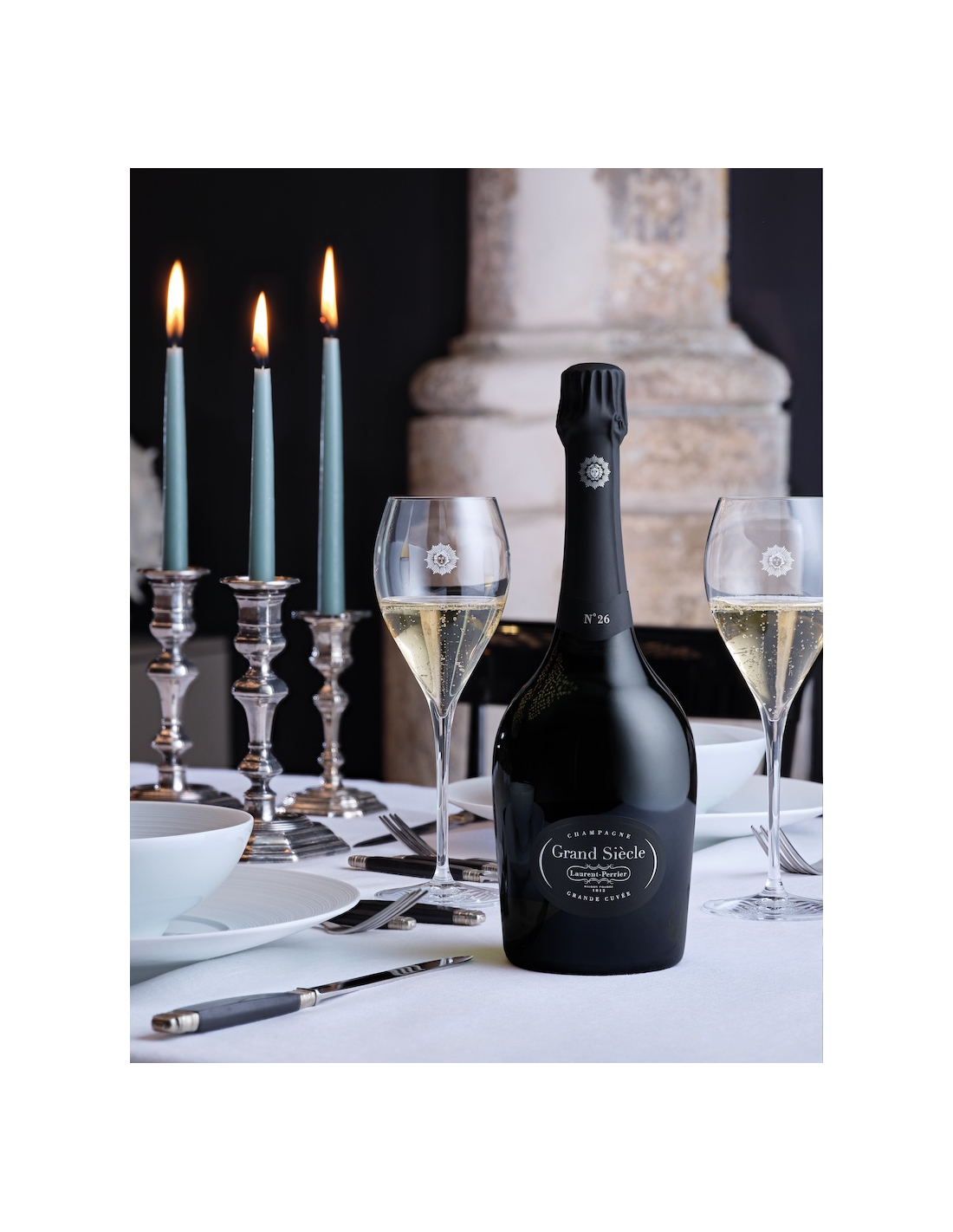 Coffret Deluxe Grand Siècle 2 verres Grand siècle avec logo sur verre et sur pied & 1 bouteille 75 cl Grand Siècle itération 26. Recréer l’année parfaite