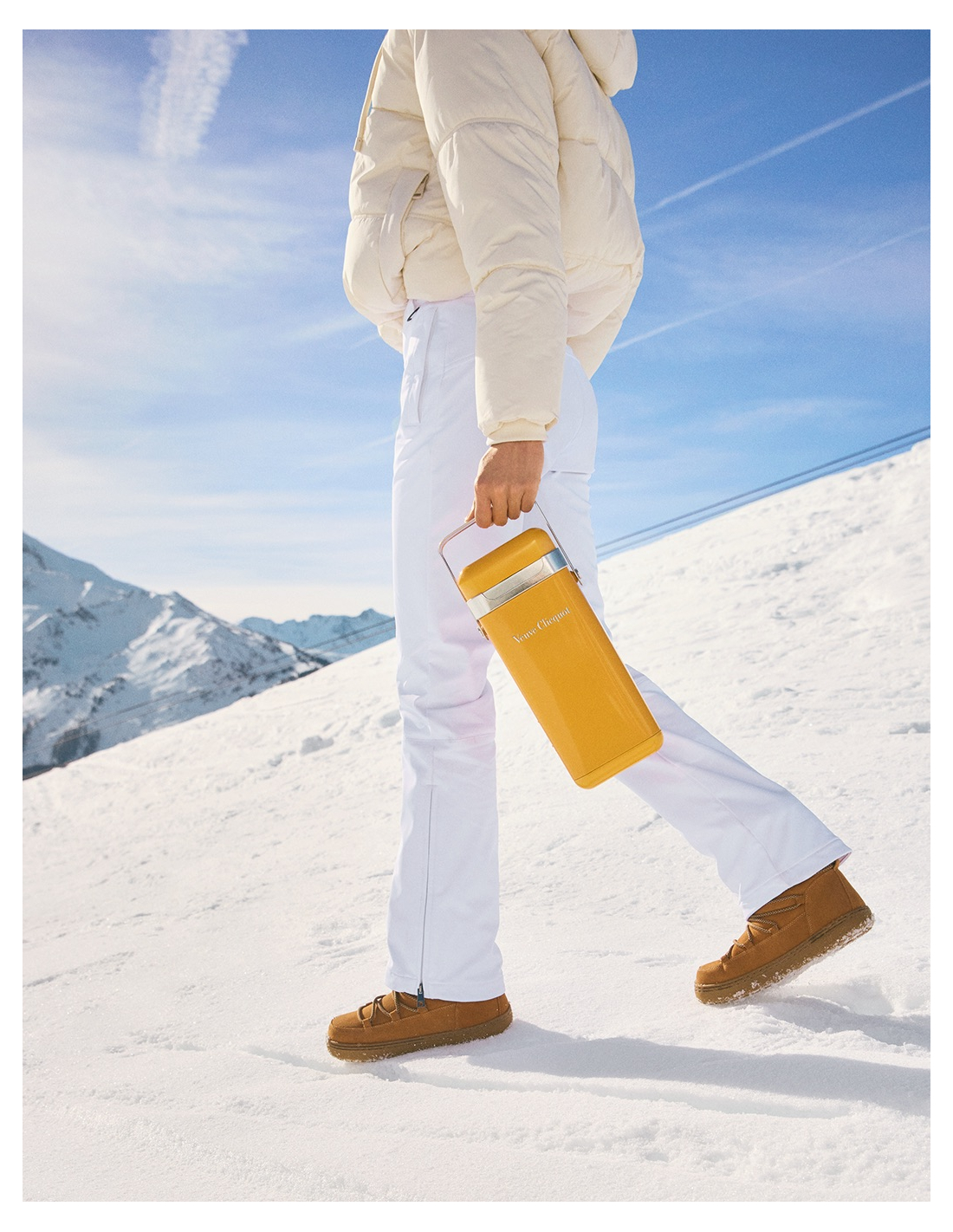 Conçu spécialement pour transporter une bouteille de Yellow Label ou de Rosé, ce nouvel objet fonctionnel peut être porté en bandoulière ou à l’épaule. Nomade mais également pratique, il conserve le champagne à température idéale pendant une heure, un essentiel pour un pique-nique.